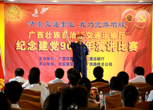 来自自治区公路管理局的王蕾以“平凡的铺路石”拉开比赛的帷幕。比赛中,23位参赛选手在场上尽情发挥,用自己的所见所闻讴歌中国共产党建党90周年以来带领中国人民取得的各项丰功伟绩,同时也展示全区交通各个战线上员工们的风采。演讲中一个个感人的故事不仅道出广大交通人的艰辛,更诉说着广大交通人对行业的由衷热爱。选手们精彩的演讲获得了在场观众的热烈的掌声。集团公司员工韦松昊以“勇于担当挑大梁创先争优当先锋”将比赛推向了最高潮,他声情并茂富有韵味的表现得到了评委和观众的一致好评,最后以97.54分的成绩夺取了此次比赛的冠军,集团公司另两位选手梁启梦、蒋华分别获得比赛二、三等奖。