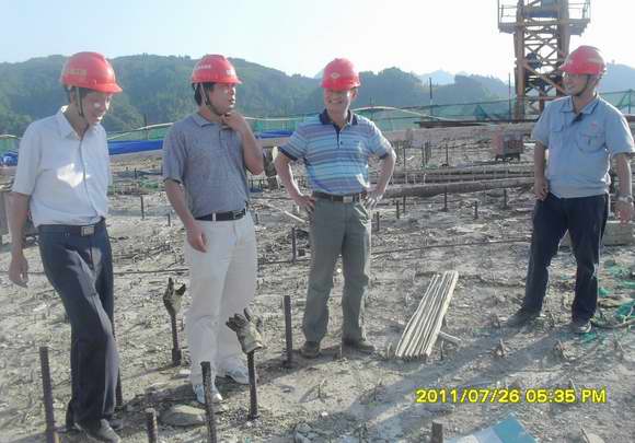图为:自治区交通运输厅王劼耘总工程师(右三)在拉会高架大桥施工现场调研指导