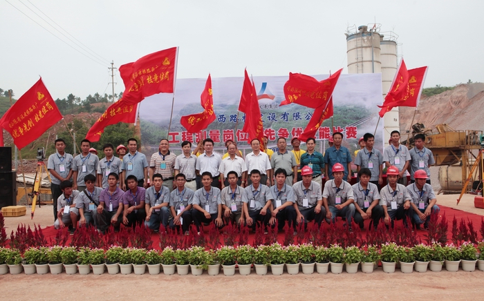 9月2日,广西路桥建设有限公司在六钦1标举办工程测量岗位创先争优技能比赛。广西交通工会、海员工会主席黎建华,自治区交通运输厅直属机关党委专职副书记罗华芝,集团,公司党委副书记张友坐等领导出席比赛开幕仪式并讲话。