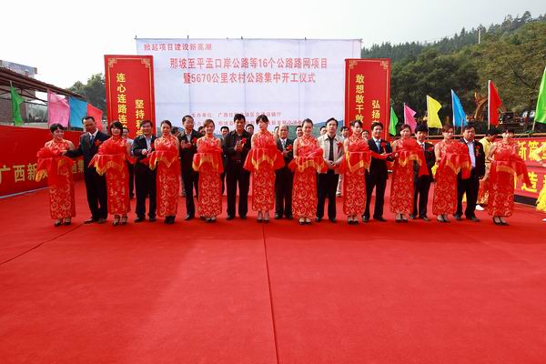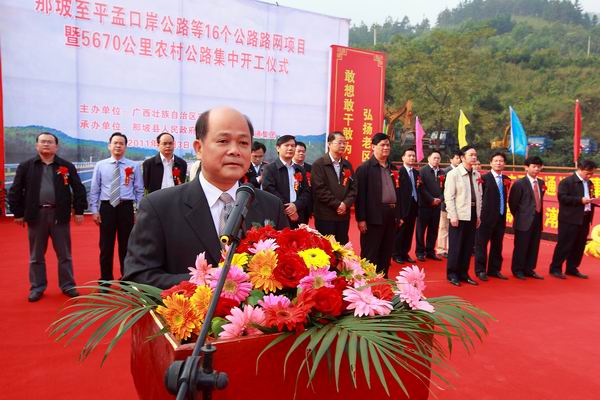 为贯彻落实自治区党委、政府在全区掀起项目建设新高潮的决策部署,冲刺第四季度,完成全年公路建设目标任务,自治区交通运输厅于11月3日举行全区公路路网改造项目集中开工仪式。由集团公司承办的分会场——那坡至平孟口岸公路等16个公路路网项目暨5670公里农村公路集中开工仪式在百色市那坡县德隆乡隆重举行。自治区交通运输厅纪检组长、厅党组成员朱名胜,百色市市委常委、政法委书记周武红,市人大常委会党组成员黄五同,集团公司党委书记、董事长朱坚和、总经理李定伦、党委副书记张友坐、副总经理刘明洪、总工程师覃炳贤,自治区公路管理局、百色市公路管理局、交通运输局、那坡县四家班子、集团公司直属各单位领导及有关部门负责人等出席开工仪式。