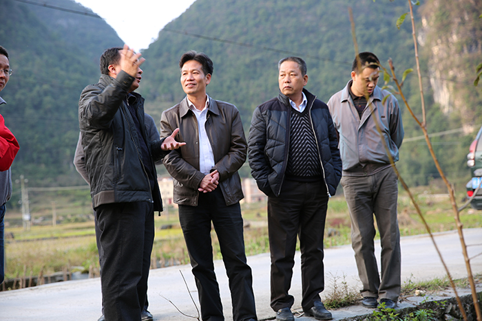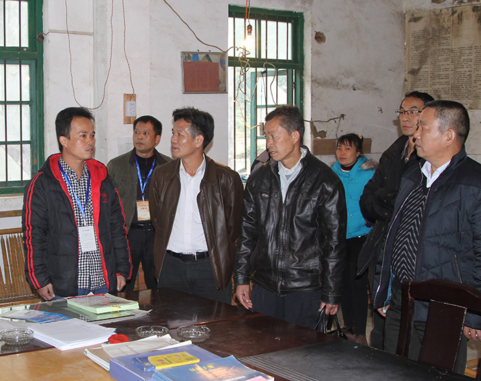 集团公司朱坚和董事长(左三)、张友坐副书记(右一)听取驻村”第一书记“梁义宽汇报工作。 在相尧村、豹山村、才帛村,朱坚和董事长分别与当地镇、村干部以及覃献康、梁义宽、蒋博三位派驻农村“第一书记”和扶贫工作队队员进行亲切交谈,详细询问“第一书记”工作、生活情况,并听取了“第一书记”关于帮扶村的党建及村集体经济发展情况汇报。得知目前各驻村书记及扶贫工作队员已经完成精准扶贫入户摸底调查时,朱坚和董事长对“第一书记”到村以来,深入调查走访,积极帮助村里理思路、定规划、办实事,表示充分肯定。