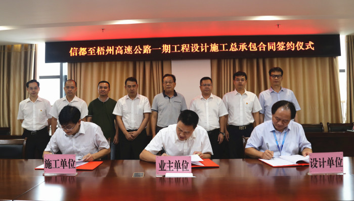 在参会各方共同见证下,项目业主单位、设计单位、施工单位的代表进行了信梧路一期设计施工承包合同的签约。(罗成斌/文 彭丽洁/图)