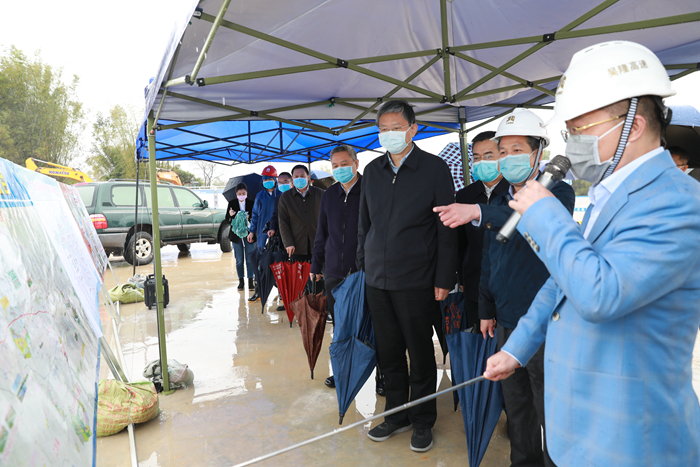 自治区副主席费志荣(右四)到吴隆路施工现场调研交通项目复工建设情况